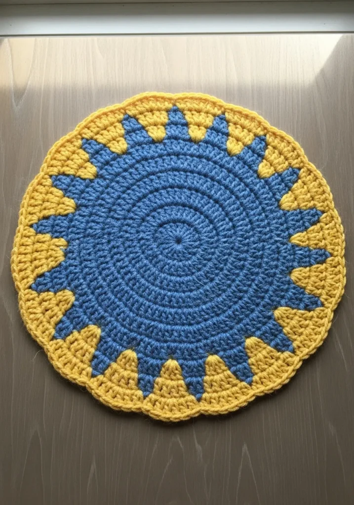 This cheerful table accessory features a deep cornflower blue center that radiates outward into a bright golden yellow border. The design is worked in the round with a clever pointed pattern that mimics the rays of the sun where the two colors meet. It is finished with a soft, wavy edge that adds a bit of delicate movement to the circular shape. The piece appears to be made from a sturdy cotton yarn with tight double crochet stitches, which creates a flat and heat-resistant surface perfect for protecting your dining table.