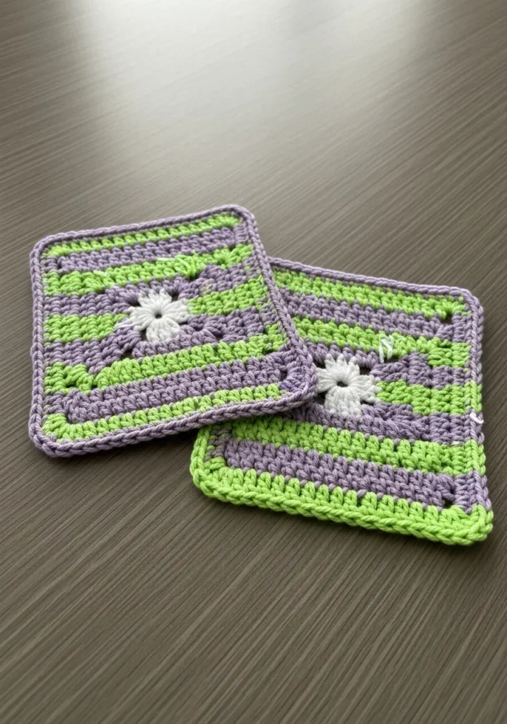 These delightful coasters feature a tiny white daisy blooming right in the center of a perfectly square frame. The background is a playful mix of alternating lavender and lime green stripes that radiate out toward a neat lavender border. They are crocheted with a crisp cotton yarn, which gives the stitches a very defined and flat appearance that is ideal for resting your favorite mug. The texture is firm and absorbent, with the little white flower adding a subtle raised detail that feels so charmingly handmade.