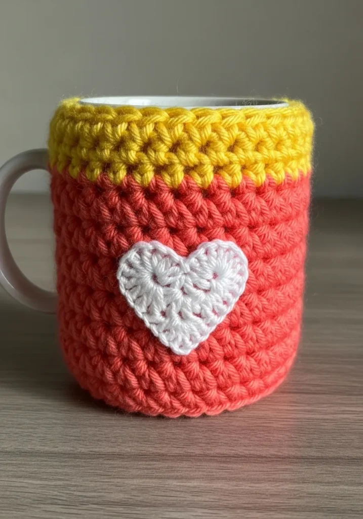 This darling mug sleeve features a juicy coral pink base topped with a sunny yellow ribbed collar that hugs the rim of your cup perfectly. Right in the center sits a crisp white heart appliqué that gives the whole piece a sweet and affectionate vibe. The crochet work is chunky and dense, which ensures your hands stay cool while your coffee stays piping hot. It is likely made with a soft cotton yarn to provide that great tactile grip and a bit of stretch for different mug sizes.
