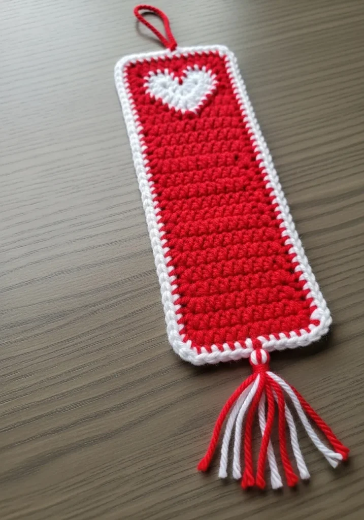 This charming bookmark features a bold cherry red body with a crisp white heart integrated directly into the top of the design. The entire rectangular piece is framed with a neat white border and finished with a playful red and white striped tassel at the bottom. It is worked with a tight single crochet stitch, ensuring it remains slim enough to slip between the pages of a favorite novel without damaging the binding. A small red loop at the very top makes it easy to grab, adding a final touch of thoughtful functionality.