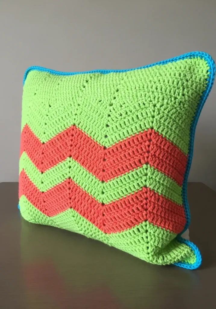 This eye-catching home accessory features a bold lime green base accented with a striking coral-pink chevron stripe running through the center. The design is finished with a thin, vibrant cyan border that perfectly frames the rectangular cushion. Crafted with a classic ripple stitch, the pillow displays a lovely “V” shaped texture that adds physical depth and a geometric flair to the piece. It appears to be made from a medium-weight cotton or acrylic blend, providing a smooth finish and enough durability to withstand everyday lounging.