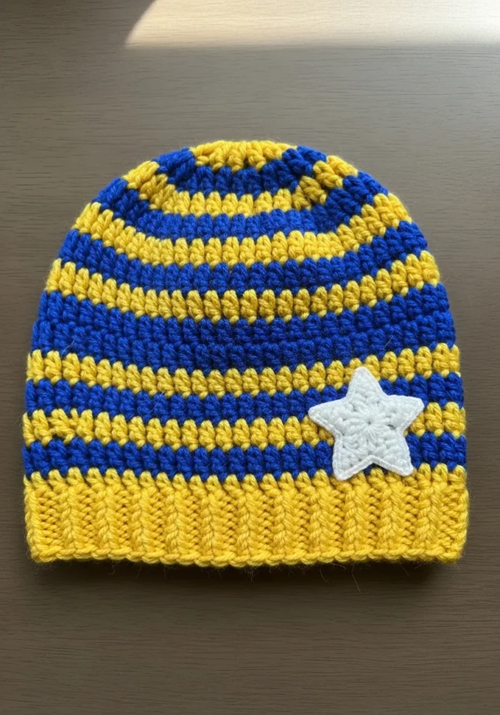 This adorable hat features a striking pattern of bold cobalt blue and sunny yellow stripes that really make a statement. The design is finished off with a wide ribbed brim in solid yellow and a super cute white star appliqué stitched right onto the side. It looks like it was crafted using a soft, medium-weight yarn that provides plenty of stretch and warmth without being too bulky. The texture is wonderfully rhythmic, with the star adding a sweet raised detail that gives the whole piece a playful and finished look.