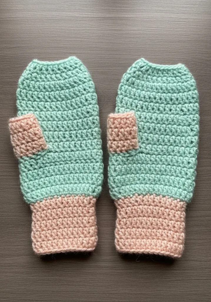 These stylish fingerless gloves show off a gorgeous mint green shade on the main hand portion with a sweet contrasting peachy pink on the ribbed cuffs and thumbs. The design features open tops and thumb holes, which make them perfect for anyone who needs to use their phone while staying warm. They look like they were made with a soft blended yarn that has a slight halo effect for extra coziness. The texture is thick and sturdy with clear rows of stitches that give the piece a lovely rustic yet polished finish.