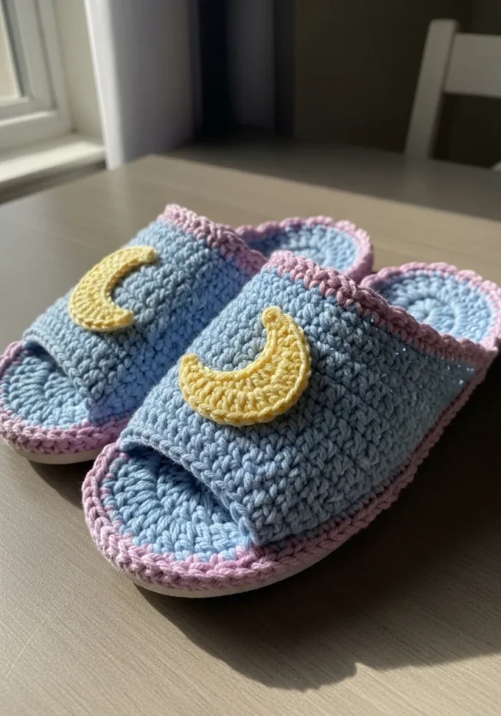 These spa-inspired slippers feature a serene sky blue base with a delicate lavender trim that frames the entire sole and strap. The highlight of the design is the cheerful yellow crescent moon appliqué sitting right on top of each foot. They are constructed with a sturdy cotton yarn that offers a wonderful breathable texture while maintaining enough structure to hold their shape. The soles are worked in dense rounds to provide a cushioned feel, and the top straps have a nice, flexible stretch for maximum comfort while lounging.