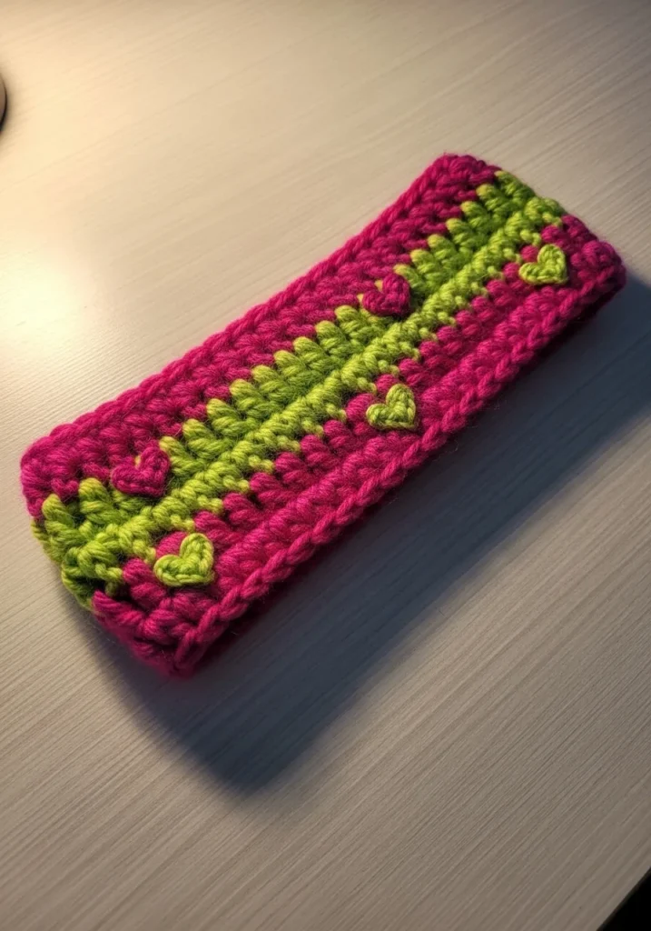 This vibrant ear warmer features a striking contrast between deep fuchsia pink borders and a bright lime green center stripe. The design is elevated by tiny crocheted heart appliques in alternating colors that dance across the middle band. It is worked in a thick, chunky yarn that gives the piece a wonderful squished texture and plenty of loft for keeping ears warm on windy days. The stitches are large and defined, which makes the color changes look super sharp and playful.