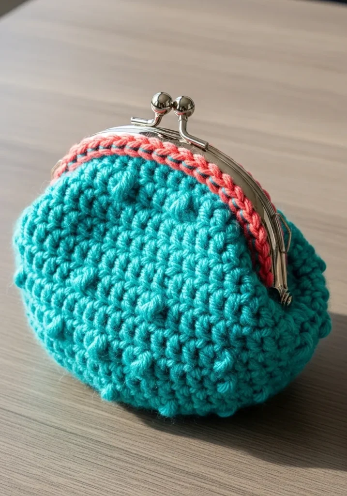 This darling little coin pouch features a rich teal body with a spicy coral trim along the top edge. It is finished with a classic silver metal kiss lock frame that gives it a wonderful vintage silhouette. The crochet work uses a dense bobble-like stitch, which creates a nubby and tactile surface that feels substantial in your hand. Using a sturdy mercerized cotton or a structured synthetic yarn ensures it keeps its plump, rounded shape even when it is filled with all your loose change and lip balms.