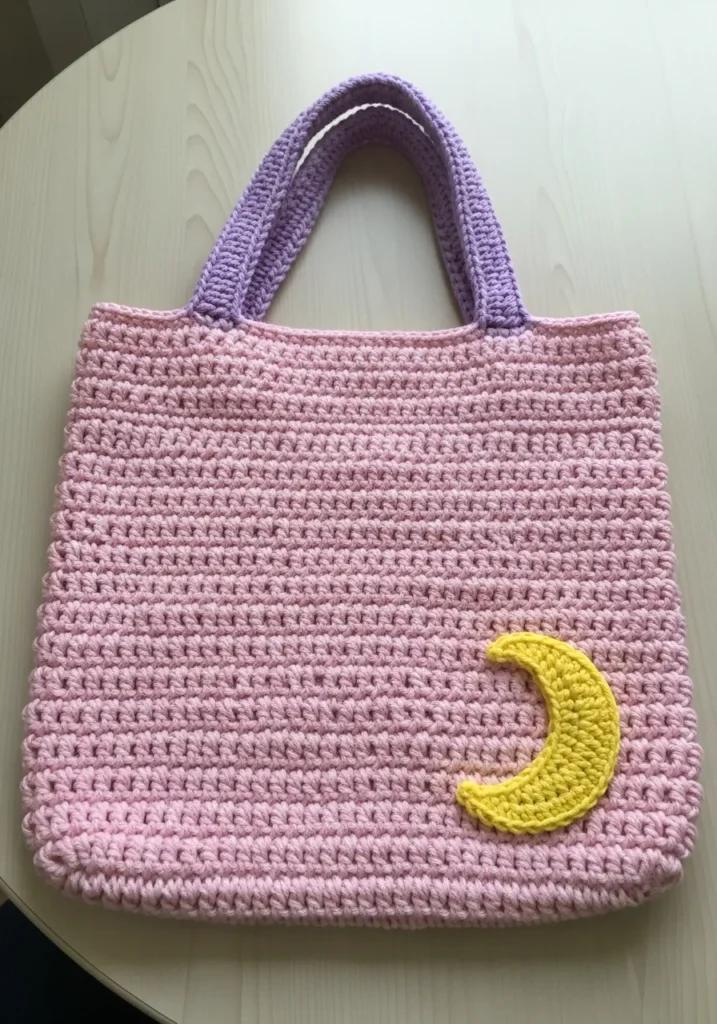 This dreamy handbag features a soft bubblegum pink body paired with sturdy lavender handles for a gentle color-blocked look. A cheerful lemon-yellow crescent moon is appliquéd in the bottom corner, which gives the whole piece a magical and celestial touch. It is worked with a thick t-shirt yarn or a bulky cotton cord that creates a lovely ridged texture and ensures the bag stays structured and strong. The dense stitches mean you won’t have to worry about your essentials peeking through the gaps while you are out and about.