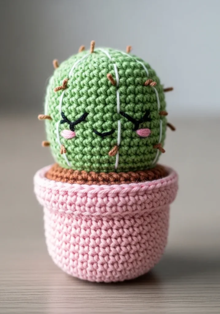 This adorable crochet cactus is made with soft green yarn stitched into a rounded shape and topped with tiny embroidered spikes for that classic cactus look. The little face with closed eyes and rosy cheeks adds such a sweet personality. It sits snugly inside a blush pink crochet pot that has a slightly ribbed texture, giving it that cozy handmade charm. The mix of pastel pink and fresh green feels light and cheerful, and the tight, even stitches make the whole piece look neat and polished while still soft and squishy.