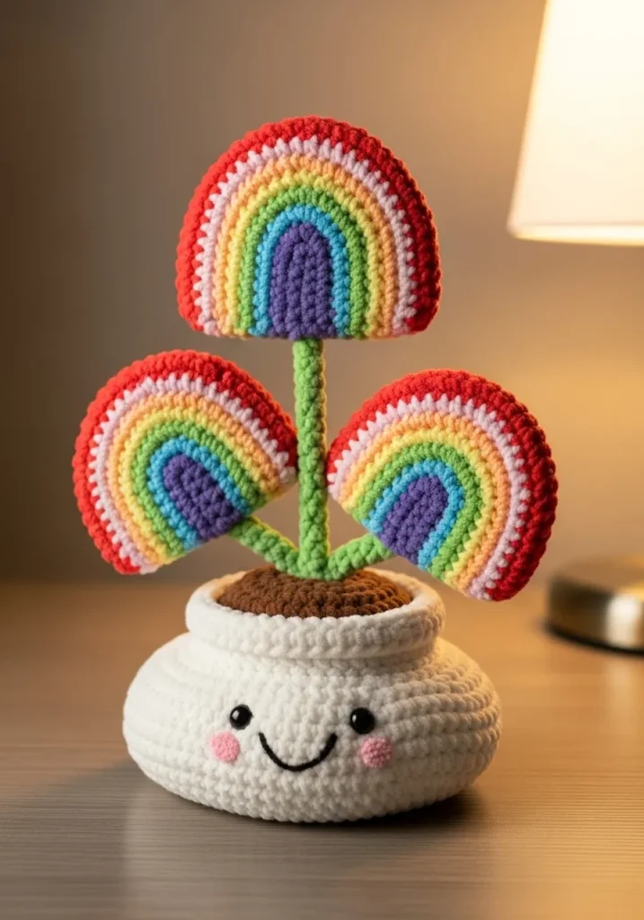 This crochet rainbow plant is pure joy in yarn form. Three layered rainbow arches rise from a green stem, each one stitched in bright red, orange, yellow, green, blue, and purple stripes. The rainbows are placed in a soft cream crochet pot with a sweet smiling face and rosy cheeks. The colors are vibrant and bold, while the soft yarn texture keeps everything cozy and handmade.