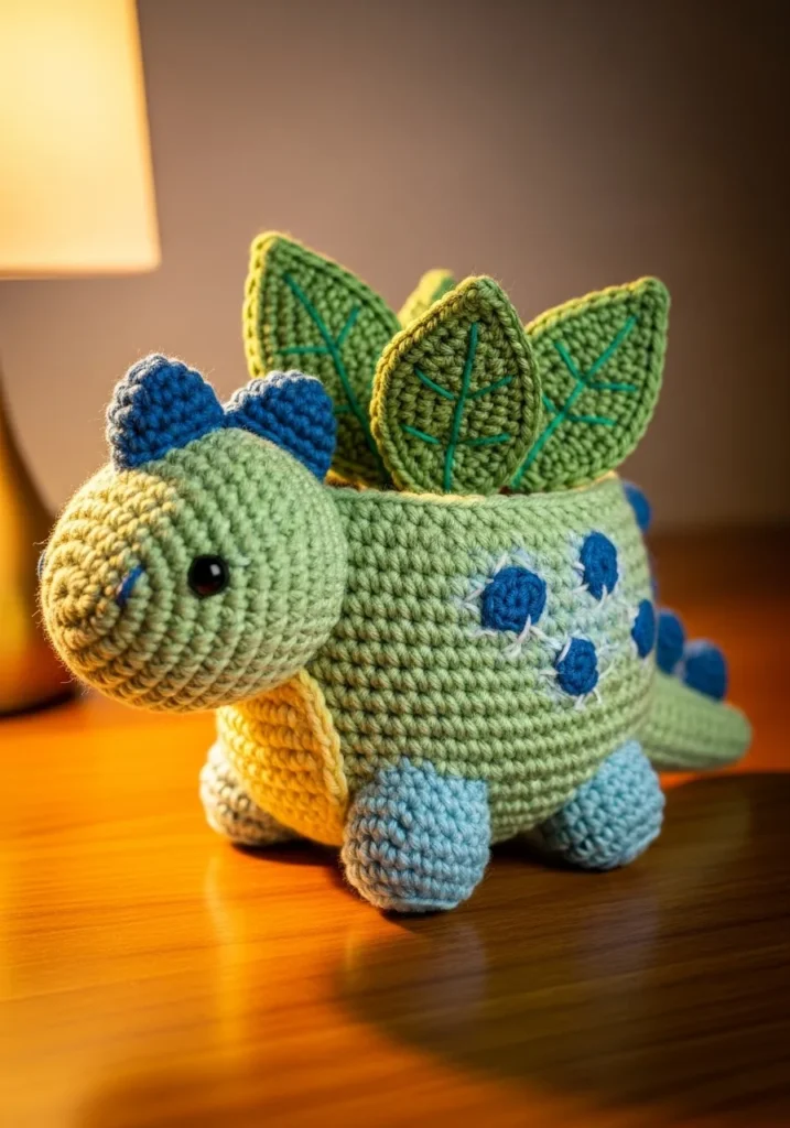 This crochet dinosaur planter is bursting with personality. The soft green and blue body is stitched in tight rounds with small decorative spots along its sides. Leafy crochet plants sprout from the back like little spikes, blending the plant theme into the design in such a clever way. The rounded shape and tiny stitched eyes give it an irresistibly cute look.