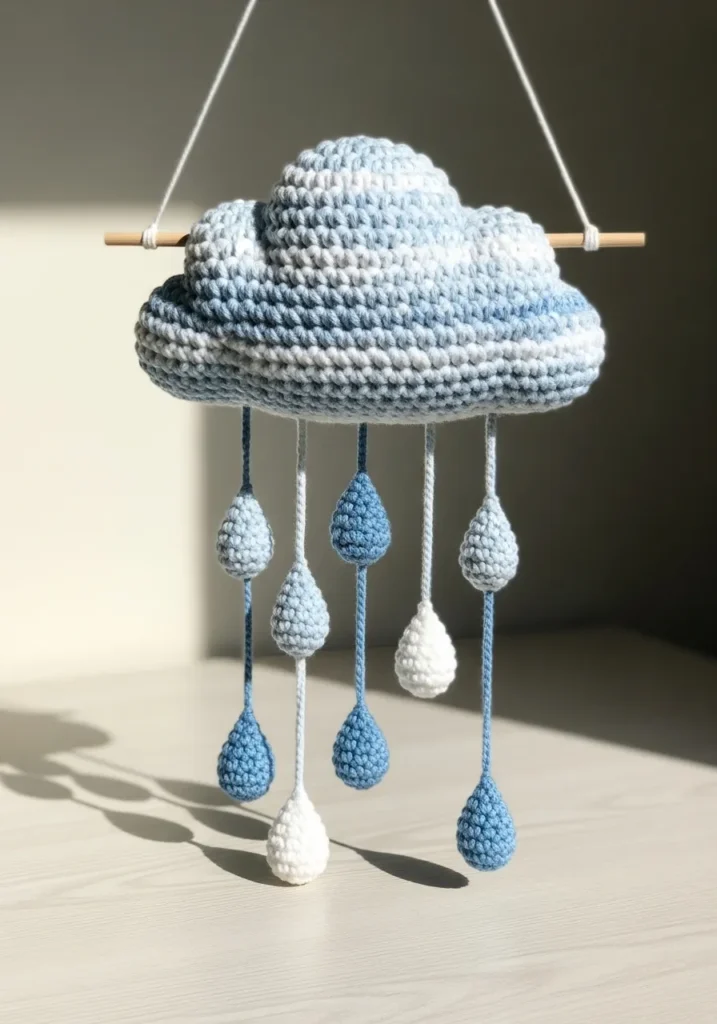 This crochet cloud mobile features a soft puffy cloud stitched in pale blue yarn with a plush rounded shape. From the bottom hang delicate raindrops in alternating shades of sky blue and white, each one gently dangling from thin crochet chains. The cloud is suspended from a simple wooden rod with neutral cords, giving it a light airy look. The stitches are tight and smooth, which makes the whole piece feel neat yet cozy.