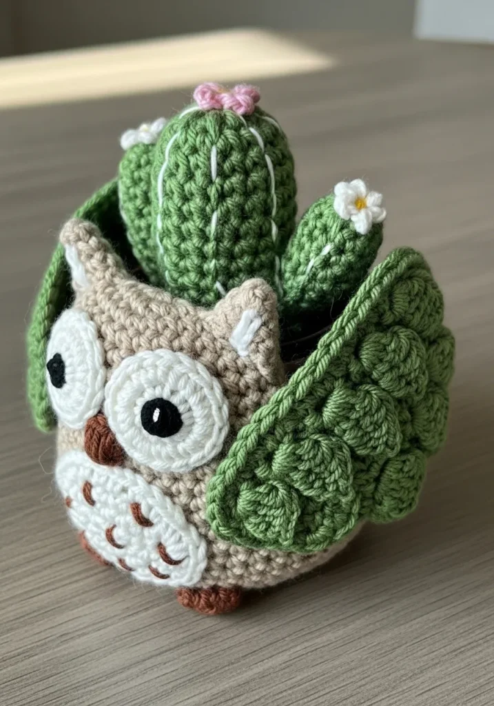 Crochet Owl Planter with Cactus Crown