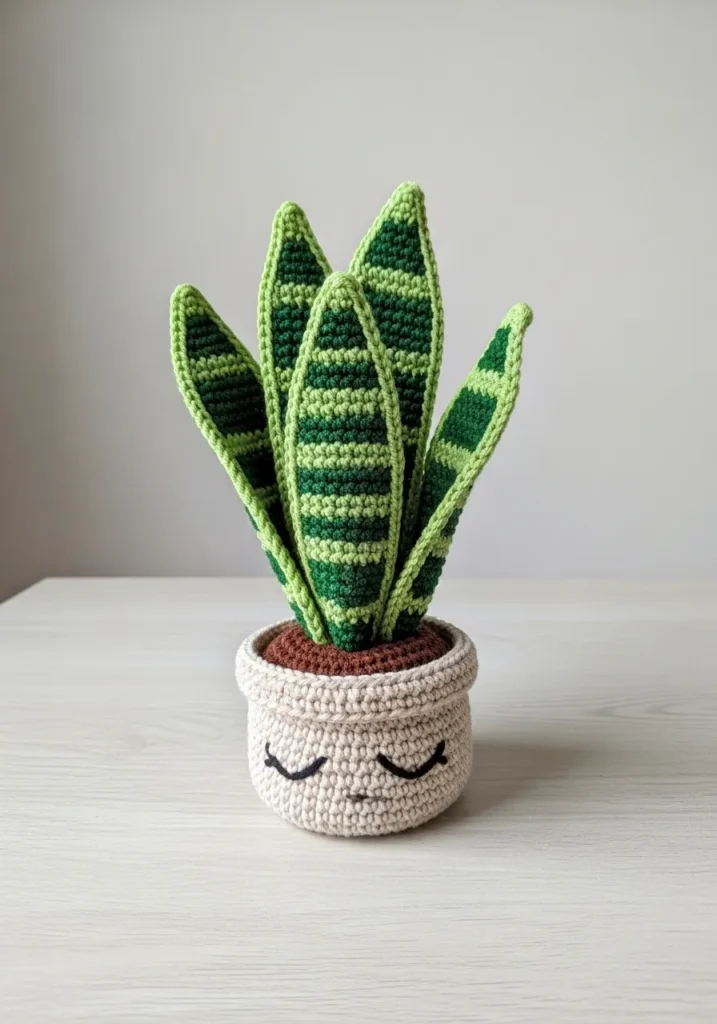 This crochet snake plant features tall pointed leaves in rich green yarn with lighter stripes stitched down the center. The leaves stand upright and slightly curved, giving it that realistic houseplant look. It sits in a small beige crochet pot with closed embroidered eyes that add a peaceful expression. The texture is simple and clean, which makes the plant feel modern and fresh.