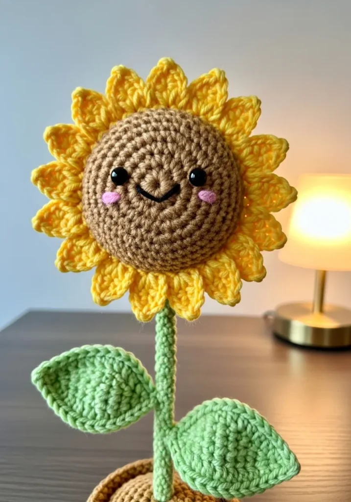 This cheerful crochet sunflower features warm golden yellow petals surrounding a textured brown center with the cutest smiling face. The petals are slightly raised, giving the flower a full and lively look. A sturdy green stem and two soft crochet leaves complete the design, all sitting upright like a real blooming sunflower. The yarn choice gives it a plush texture, and the bright colors make it pop beautifully against any background.