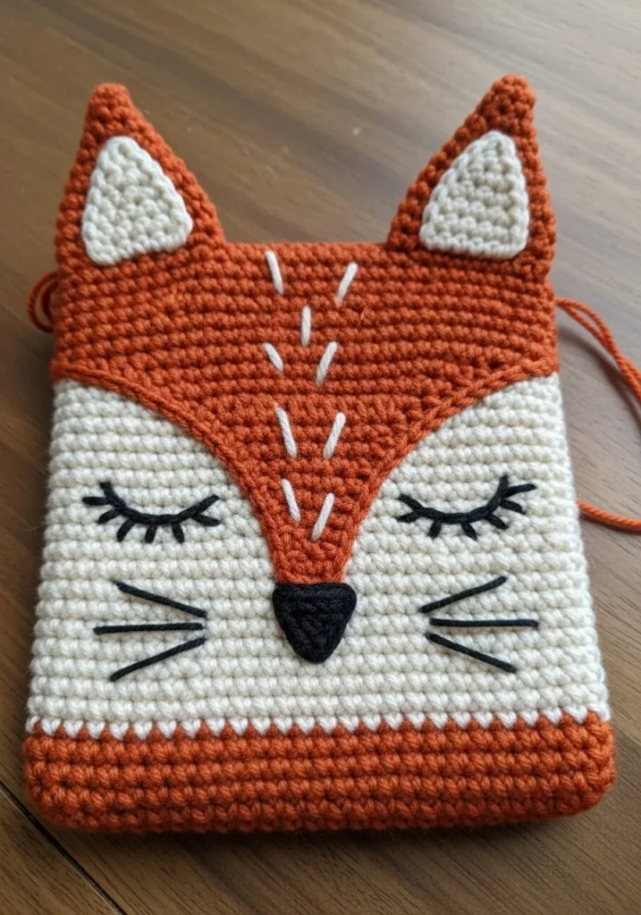 This adorable crochet pouch is shaped like a sweet sleepy fox, complete with pointy ears, embroidered eyelashes, and a tiny black nose. The body is worked in warm burnt orange and creamy white yarn, using tight, even stitches that give it a sturdy feel. Simple black thread details bring the whiskers and facial features to life. The rectangular shape makes it practical, while the playful fox design turns it into something you actually want to show off on your desk or toss into your tote.