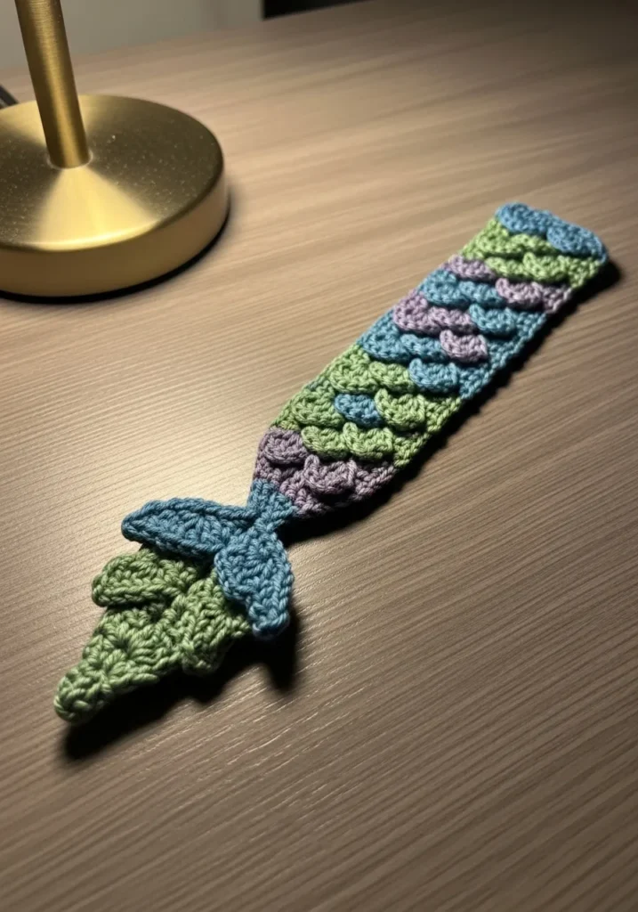 This dreamy crochet bookmark is shaped like a delicate mermaid tail, stitched in layered shades of blue, green, and lavender. The scalloped scale pattern creates beautiful texture, and the tail fin at the end adds a playful finish. It is slim enough to slip between pages without adding bulk, yet detailed enough to feel special.