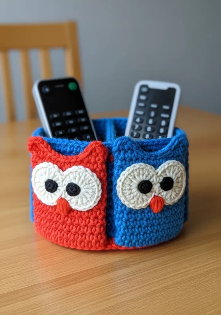 These crochet desk organizers are shaped like adorable owls, stitched in bold red and blue yarn with oversized white eyes and tiny beaks. The cylindrical shape makes them perfect for holding phones, remotes, or even pens. The tight stitching helps them stand upright, and the playful facial details give them tons of personality.
