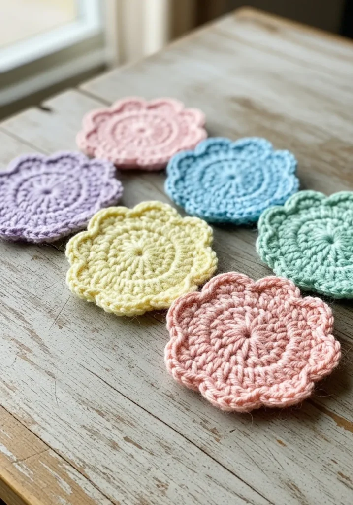 These crochet coasters are designed as delicate flowers in soft pastel shades like mint, lavender, blush, and baby blue. Each one has layered petal stitches that create a lovely textured look. The circular shape keeps them balanced on a table, and the yarn looks thick enough to absorb condensation from drinks.