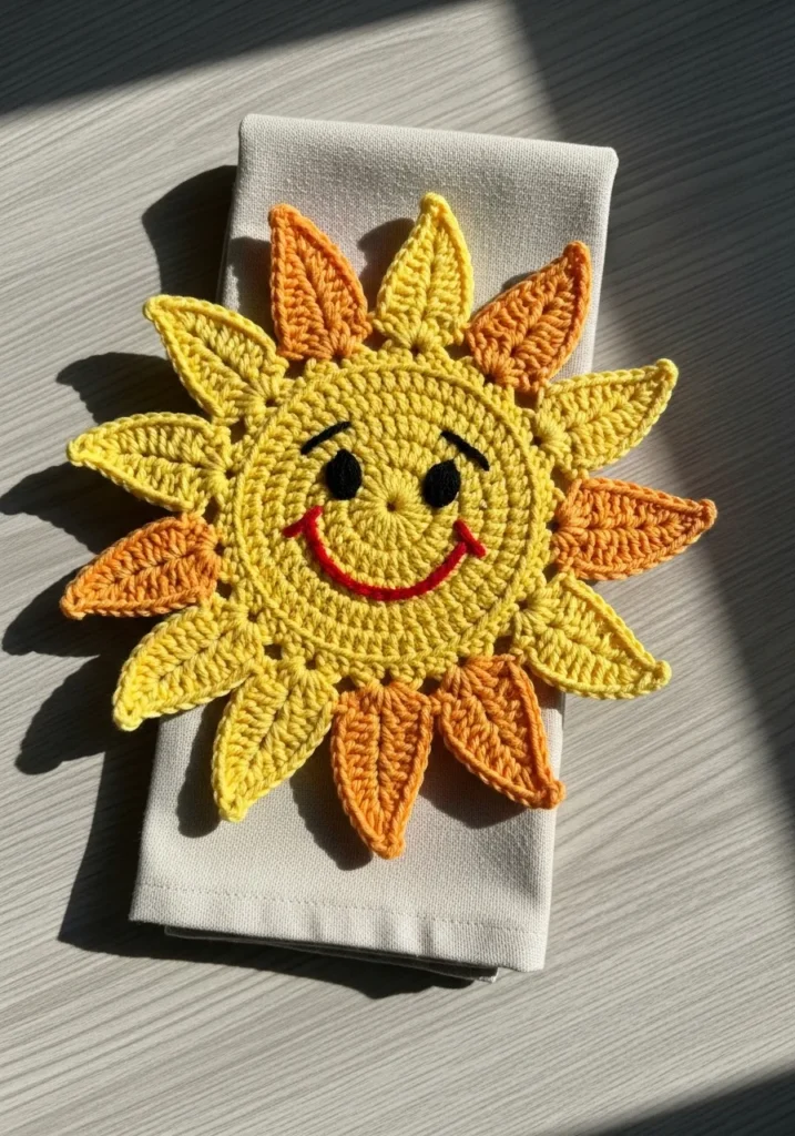 This cheerful crochet piece features a bright yellow sun with orange tipped rays and an adorable stitched smile. The textured stitches give each ray a slightly raised look, which makes the whole design pop against the neutral kitchen towel underneath. The center is worked in a tighter round pattern to create a smooth base for the embroidered eyes and rosy cheeks. It feels sturdy yet soft, perfect for everyday use in a sunny kitchen.