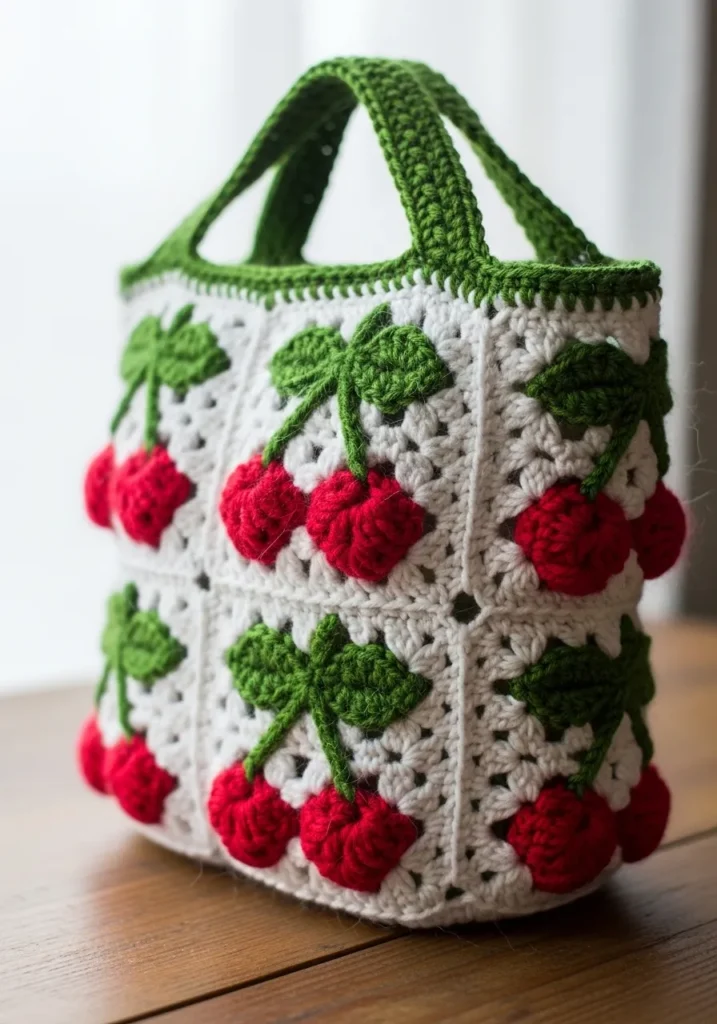 This eye catching tote bag is made from classic white granny squares decorated with bold red cherries and leafy green stems. The squares are neatly joined together, creating a structured yet flexible shape. A solid green strap ties the whole look together and adds a fresh, summery vibe. The texture of the granny stitches gives it that handmade charm while still feeling strong enough to carry daily essentials.