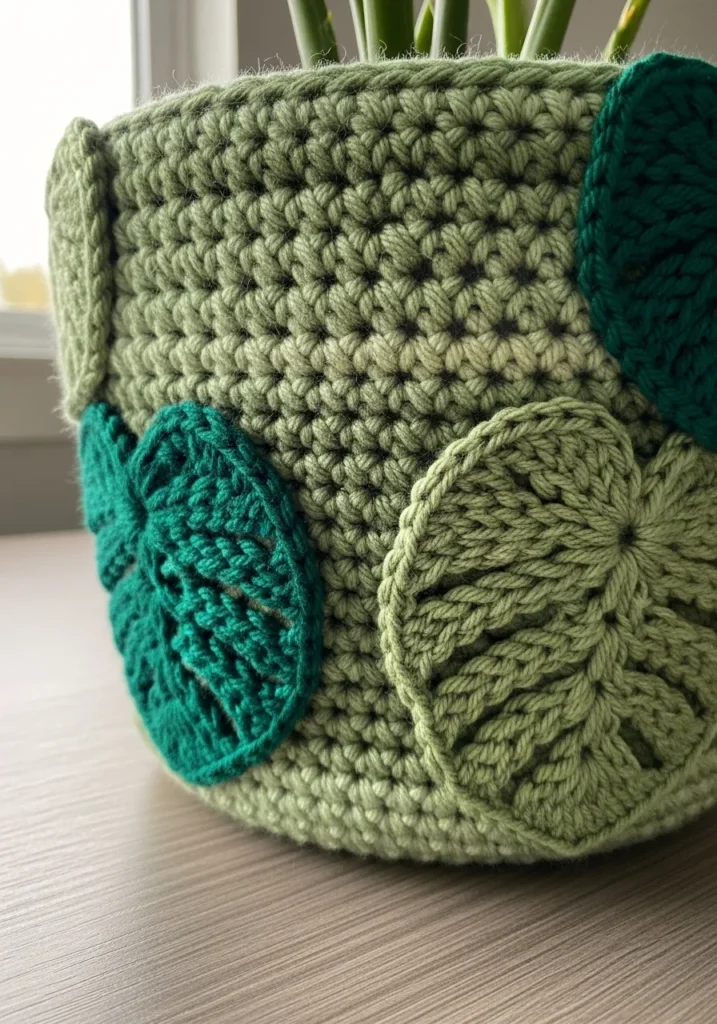 This soft green crochet basket is decorated with raised leaf appliqués in deeper and lighter shades of green. The thick yarn and tight stitches give the basket a firm structure so it can hold makeup, yarn, or small household items. The textured leaves add dimension and make the piece look more detailed and polished. It has a cozy, earthy feel that fits beautifully into a calm home space.