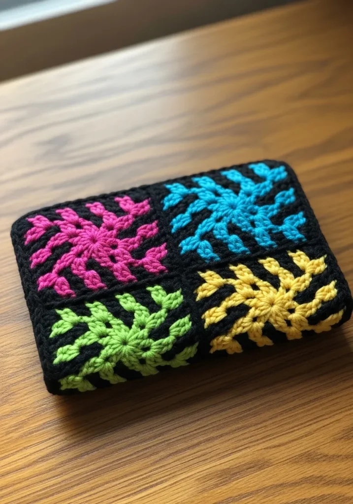 This bold crochet zipper pouch features a black base with bright neon coral shapes in pink, blue, green, and yellow stitched across the surface. The contrast between the dark background and the vibrant details makes the pattern really stand out. The rectangular shape is clean and structured, perfect for holding small tech accessories or makeup. The stitches look tight and durable, giving the pouch a sturdy feel.