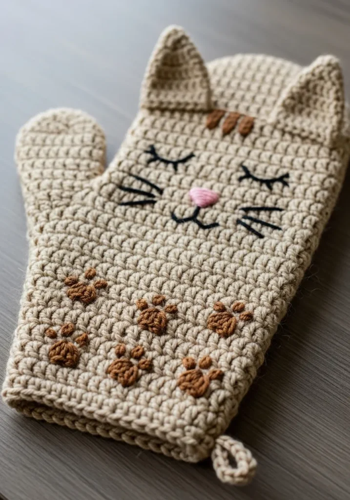 This adorable crochet oven mitt is shaped like a sweet sleepy cat, complete with stitched whiskers, closed eyes, and tiny brown paw details. The neutral beige yarn gives it a soft and warm look, while the thick stitches provide extra insulation. The rounded top forms little cat ears, which makes it both functional and charming. It looks plush and sturdy enough to handle hot pans while still feeling cozy in the hand.