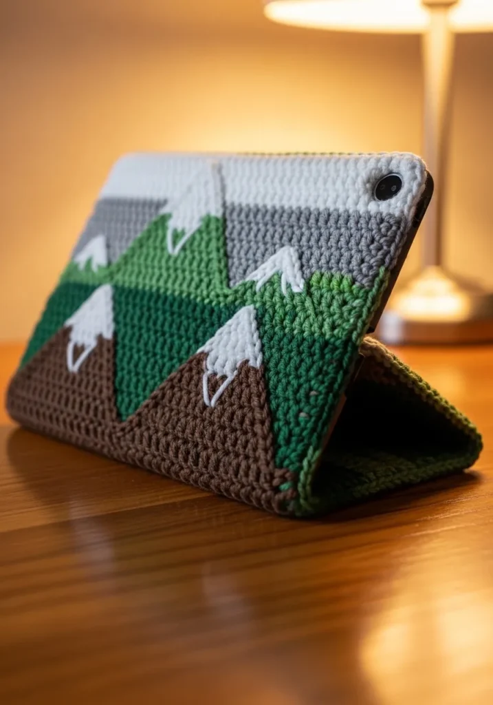 This clever crochet tablet stand features a geometric mountain landscape in shades of green, brown, gray, and white. The front panel displays layered peaks with snowy tips, while the structured triangular shape allows it to prop up a tablet or book at a comfortable angle. The stitches are firm and dense, giving the stand enough stability to actually support your device. The textured yarn adds depth to the landscape design, making it both decorative and functional.