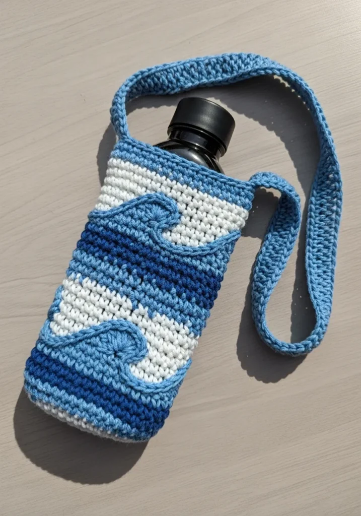 This crochet bottle holder features calming blue and white stripes arranged in a soft wave pattern. The stitches are snug and structured, creating a supportive sleeve that hugs a water bottle perfectly. A long matching strap makes it easy to carry over the shoulder or across the body. The textured waves add a beachy vibe while still keeping the design simple and practical.