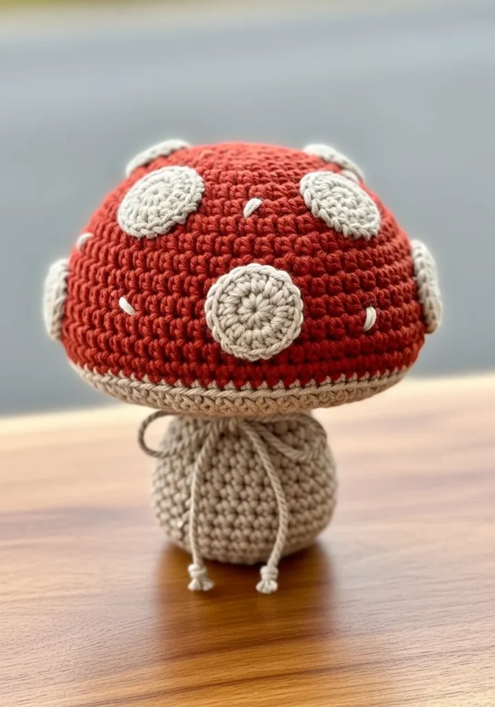 This charming crochet pouch is designed like a red mushroom with soft white spots and a beige stem base. The rounded top is worked in textured stitches that mimic the cap shape, while the bottom section is more structured to help it stand upright. A subtle opening near the top makes it perfect for storing coins, earbuds, or tiny trinkets. The playful color contrast makes it instantly eye catching.