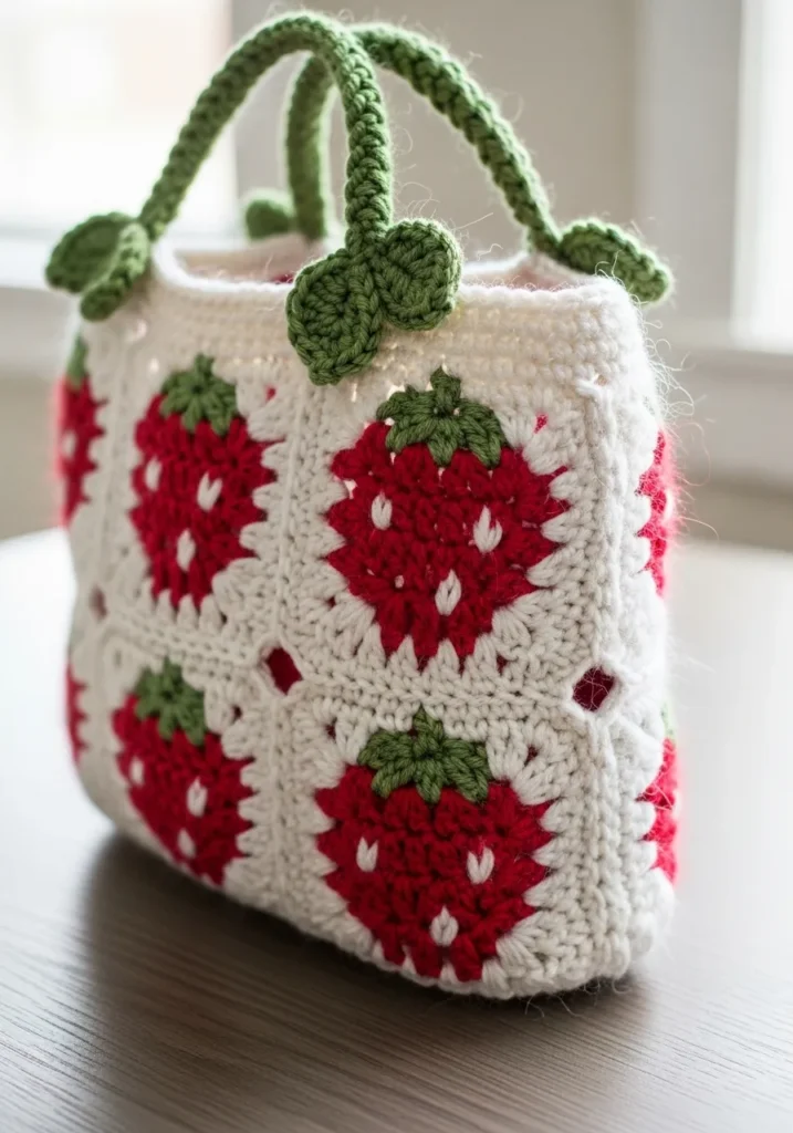This sweet crochet tote bag is made from classic granny squares featuring bright red strawberries with leafy green tops. The white background keeps the design fresh and clean, while the green handles tie everything together beautifully. The joined squares create a roomy, flexible bag that still feels structured enough for daily use. The textured stitches give it that cozy handmade look that stands out in the best way.