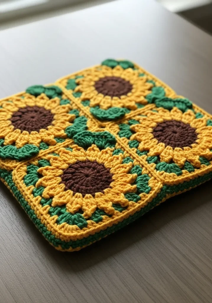 These crochet coasters are designed as bright sunflowers with golden yellow petals, deep brown centers, and leafy green borders. Each square is neatly finished, creating a sturdy base that protects surfaces while adding a pop of color. The layered petals give lovely dimension and texture, making them stand out from basic flat coasters.