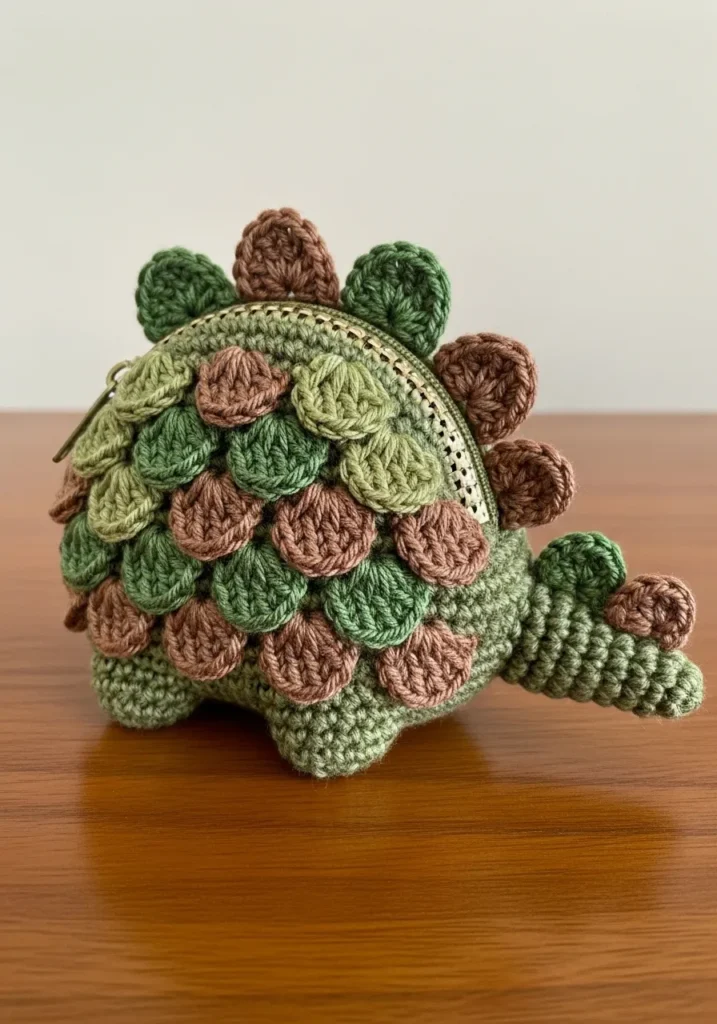 This charming crochet turtle features a textured shell made from layered green and earthy brown scales. The soft body peeks out with tiny stitched eyes and a sweet expression. The shell is slightly raised and detailed, giving it a playful 3D look. It sits nicely on a shelf or dresser and feels sturdy thanks to tight stitching and careful stuffing.
