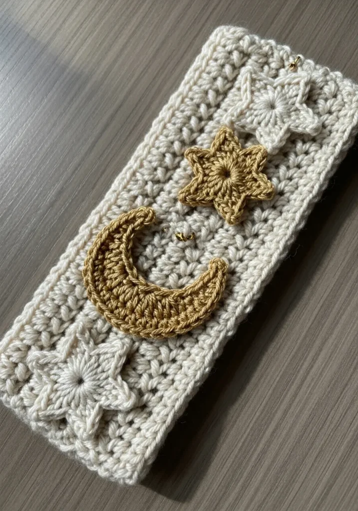 This elegant crochet bookmark is worked in creamy white yarn with raised golden moon and star appliqués stitched on top. Delicate star motifs are spaced along the length, giving it a dreamy, celestial feel. The slim rectangular shape slides easily between pages, and the textured details add just enough charm without being bulky.