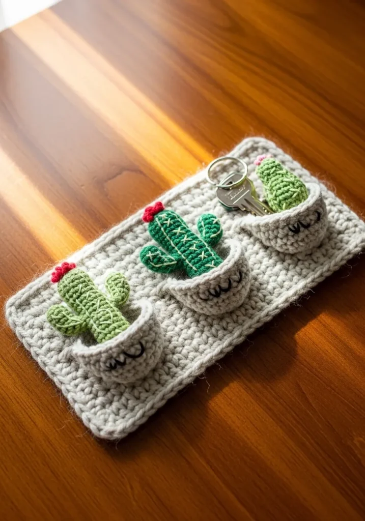 This sweet little crochet organizer features three tiny cacti stitched in soft green yarn and nestled into a neutral beige rectangular base. Each cactus has simple stitched details and tiny pops of color on top that look like blooming flowers. The base is worked in tight, even stitches so it sits flat on a desk or shelf. The texture is cozy and slightly chunky, which makes the whole piece feel sturdy yet playful.