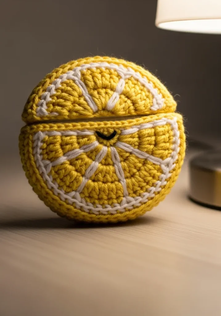 This round crochet pouch looks just like a bright lemon slice, complete with white segment lines and a cheerful yellow outer ring. The textured stitching gives the citrus pattern a bold, dimensional look. A zipper runs neatly across the center, blending right into the design while keeping your small essentials secure. The yarn appears thick and durable, which helps the pouch hold its shape beautifully.
