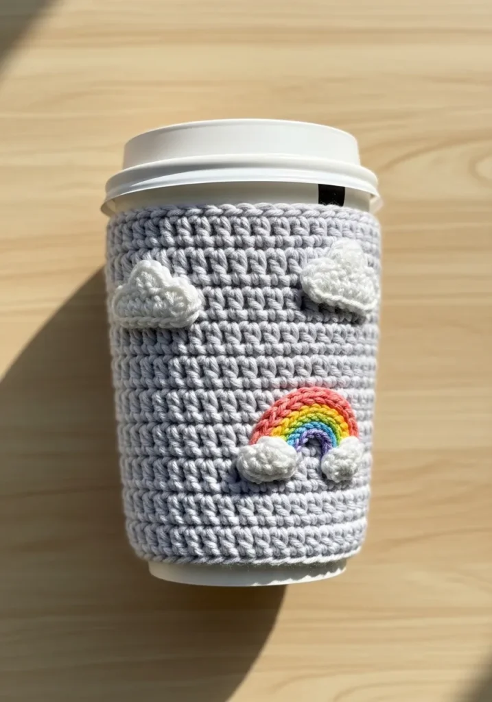 This crochet cup cozy is worked in a soft gray yarn and decorated with fluffy white clouds and a tiny rainbow stitched in bright shades. The snug cylindrical shape wraps perfectly around a takeaway coffee cup. The stitches are tight and structured, giving it a clean and modern finish while still feeling cozy in your hands.