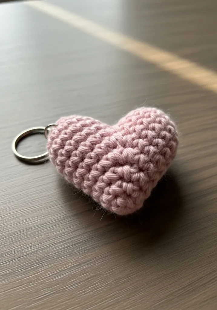 This sweet little amigurumi heart is the ultimate stash-buster project. It features a soft dusty rose yarn with a lovely matte finish and a slightly fuzzy texture that feels wonderful in your hand. The design is worked in tight single crochet stitches to create a sturdy 3D shape that holds its stuffing perfectly. Topped off with a simple silver split ring, it transforms from a simple plushie into a functional accessory that adds a pop of handmade charm to any set of keys or a favorite backpack.