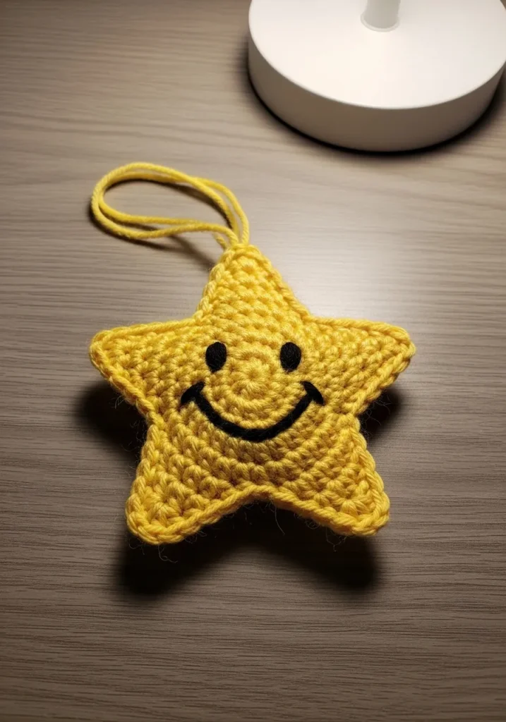This cheerful little star is whipped up using a vibrant lemon yellow cotton yarn that gives the stitches a crisp and clean definition. The design features a classic five-point star shape worked in tight single crochet rounds to create a sturdy and slightly textured surface. A friendly face is hand-embroidered right in the center with smooth black thread, featuring two simple round eyes and a wide upward-curving grin. It is finished off with a matching yellow yarn loop at the top for easy hanging and a light dusting of polyester fiberfill inside to give it a soft and squishy feel.