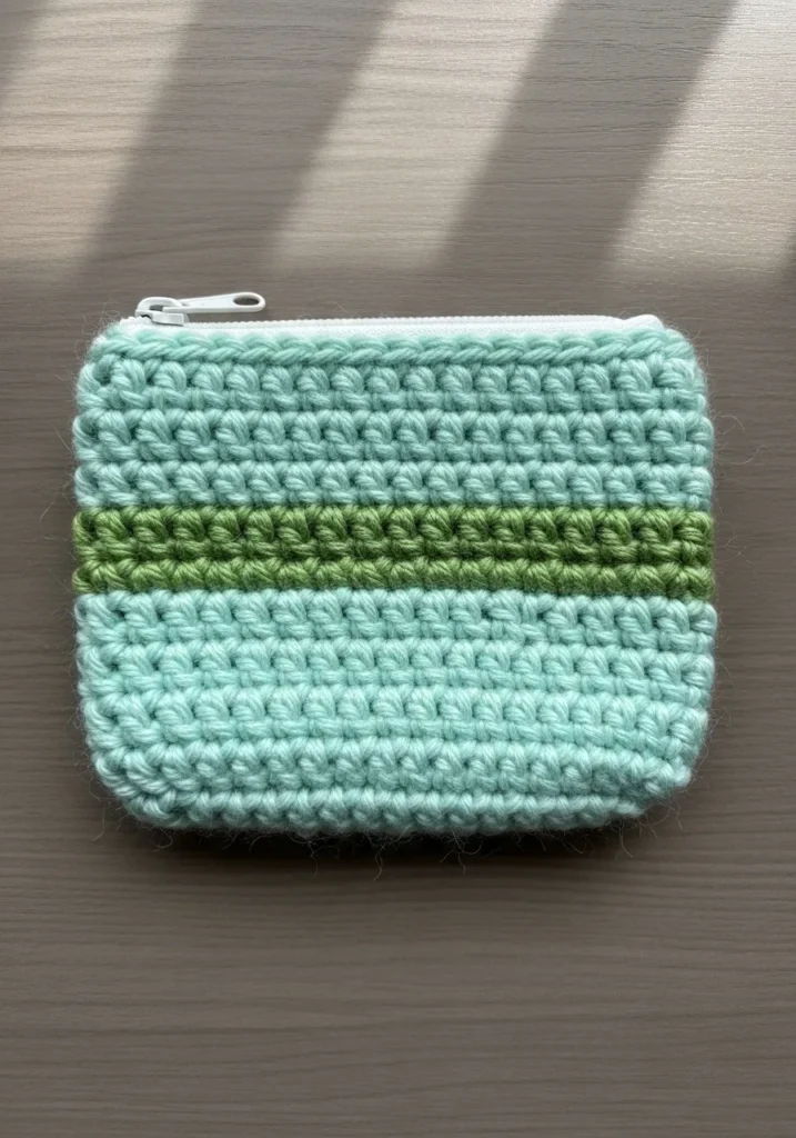 This charming zippered pouch features a sturdy texture created with thick cotton yarn in a refreshing mint green and deep forest accent. The design showcases a beautiful horizontal stripe of darker green that breaks up the mint body, adding a sophisticated touch to a simple silhouette. It is finished with a crisp white zipper that contrasts perfectly against the soft seafoam hues. The stitches are tight and uniform, making the fabric durable enough to hold loose change, lip balm, or even those tiny craft notions that always seem to go missing at the bottom of a bag.