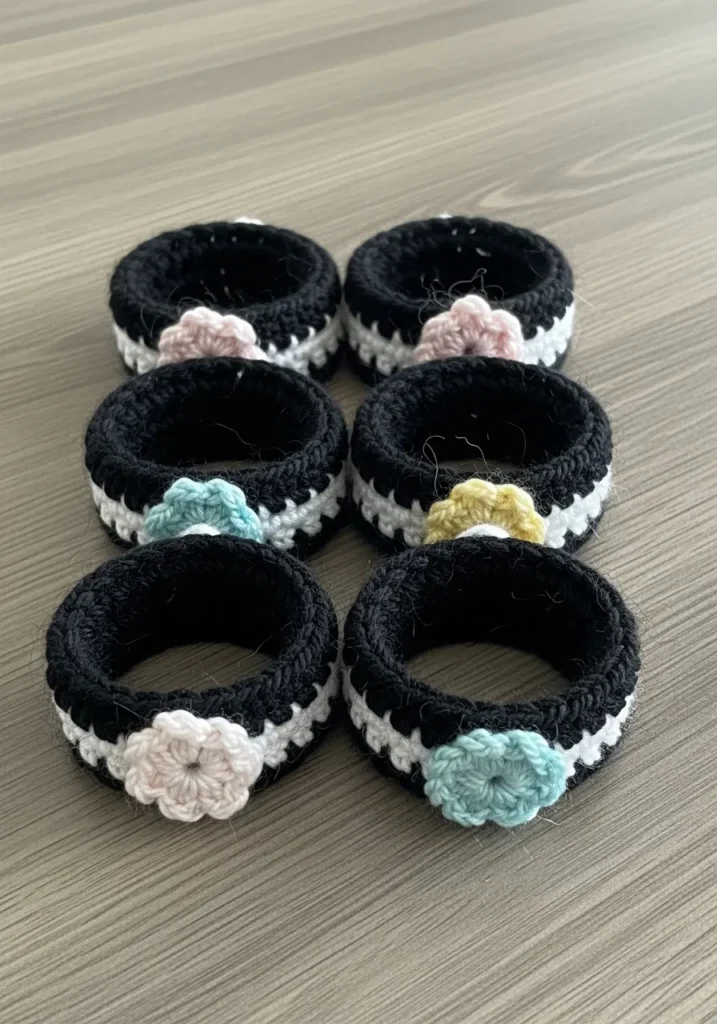 These chic napkin rings feature a sophisticated black and white striped base that brings a modern vibe to any table setting. The body is worked in a sturdy crochet stitch to maintain its circular shape, while a single, delicate pastel flower in soft pink, mint, or buttery yellow adds a sweet pop of color. The texture is a lovely mix of smooth cotton yarn and the raised petals of the tiny blossoms. Each ring looks like a miniature piece of jewelry for your linens, blending a classic monochrome palette with a touch of whimsical garden charm.