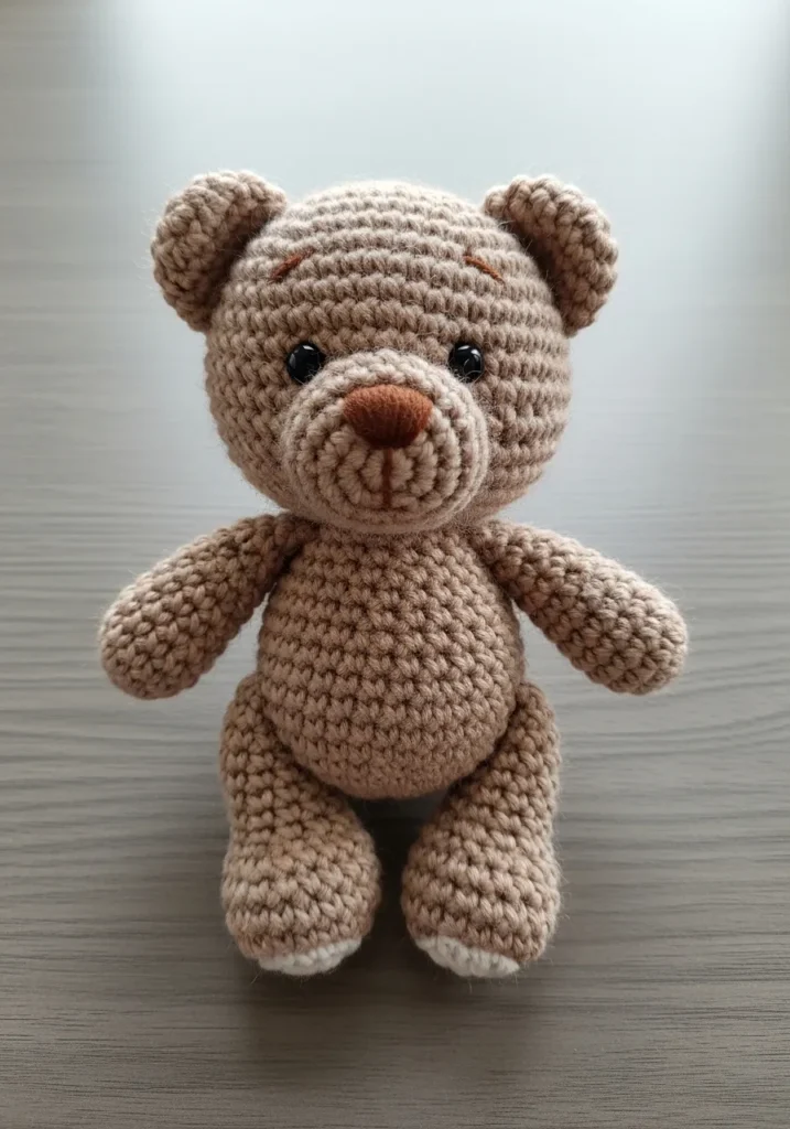 This classic amigurumi bear is made from soft oatmeal-colored yarn, with beautifully tight stitch definition that gives it a sturdy yet huggable structure. The design uses a traditional rounded head and a slightly plump belly, accented by a lighter beige muzzle and a small velvety brown nose. Little details like the tiny embroidered eyebrows and those glossy black safety eyes give it a gentle, soulful expression. It is finished off with sweet cream-colored patches on the bottoms of the feet, adding a professional touch to the simple, clean texture of the crochet work.