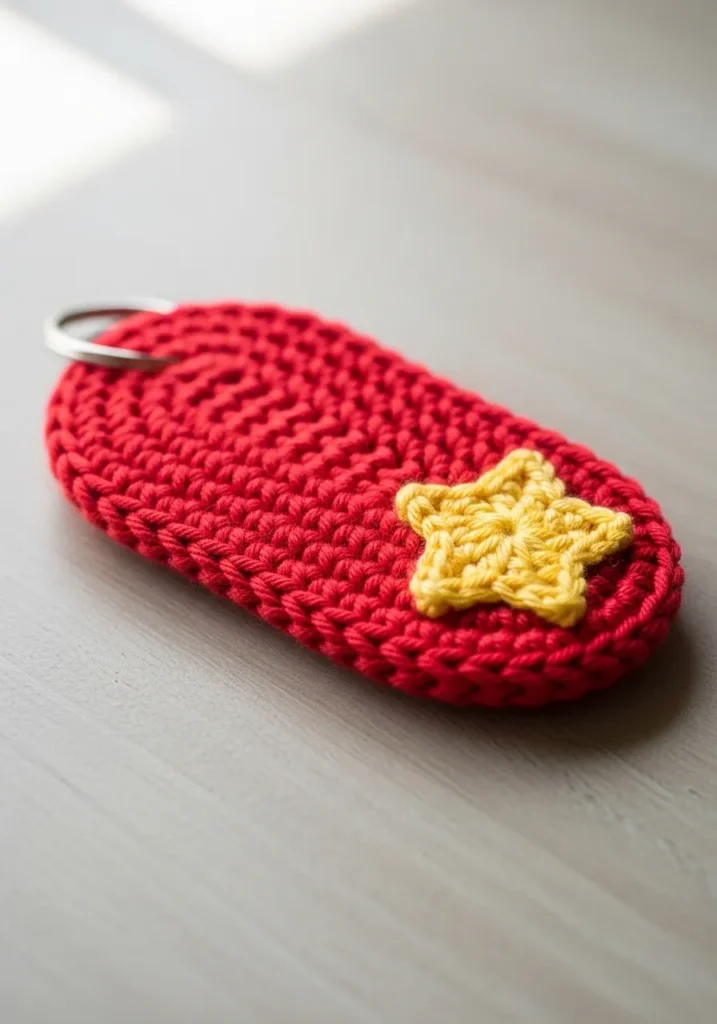This vibrant red key fob is crafted with a sturdy cotton yarn that feels substantial and durable in your hand. The design features a smooth oval shape, worked in dense single crochet stitches to keep your keys safely tucked away. A bright yellow star is securely appliquéd on the front, adding a pop of contrast and a whimsical touch to the deep crimson background. The texture is wonderfully tactile, and the silver key ring is firmly attached to the top so you can easily clip it to your bag or belt loop.