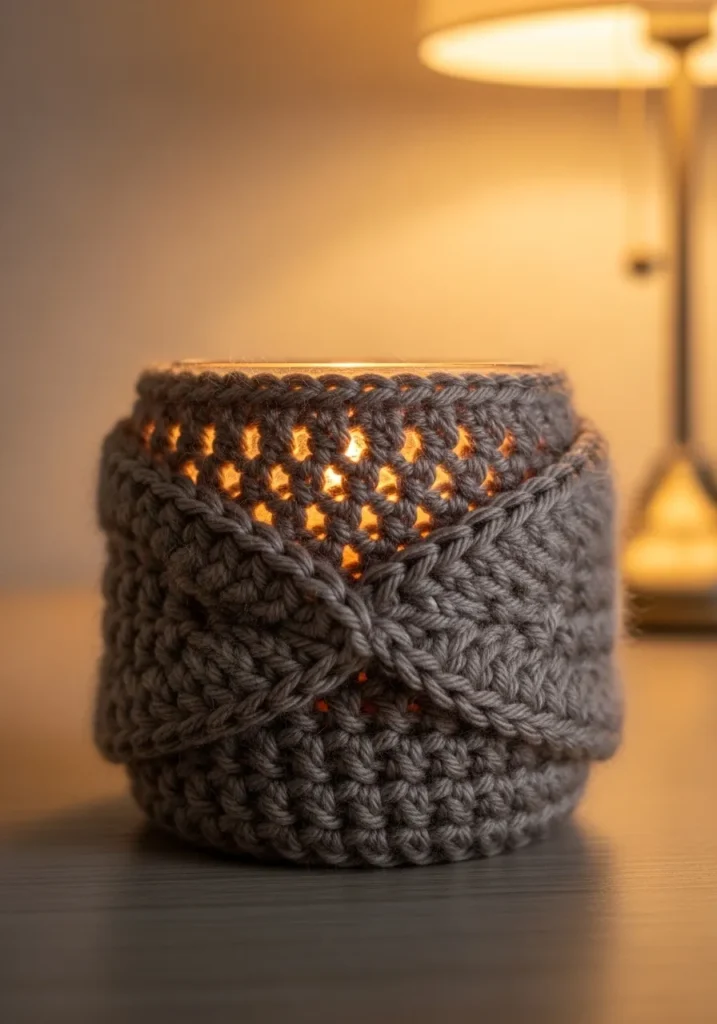 This cozy candle sleeve features a rich slate grey yarn with a heavy, heathered texture that feels incredibly soft to the touch. The design centers around a clever overlapping wrap effect that creates a beautiful “X” shape on the front, adding a modern architectural vibe to a classic home accessory. Tiny gaps in the crochet stitches allow the warm golden glow of the candle to peek through, highlighting the intricate stitch definition and the chunky ribbed edges. It fits snugly around a standard glass jar, turning a simple utility item into a sophisticated piece of decor that looks like it belongs in a high-end boutique.