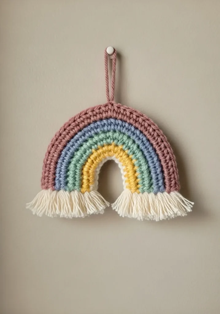 This charming crochet rainbow features a soft color palette of dusty rose, muted denim, sage green, and honey yellow. The design uses a series of concentric arches worked in textured stitches that give the piece a sturdy yet cozy feel. Each end of the rainbow is finished with thick, creamy white fringe that mimics fluffy clouds and adds a wonderful bohemian touch. It is suspended by a simple yarn loop, making it ready to hang in a nursery, a small office nook, or anywhere that needs a little splash of color.