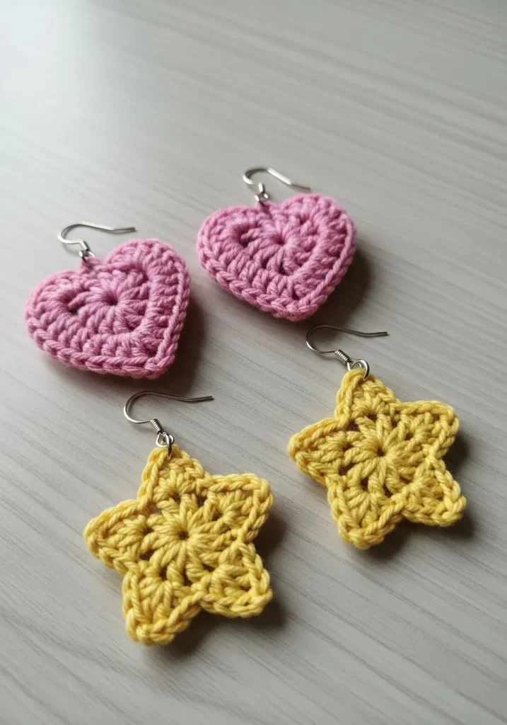 These dainty accessories feature vibrant yellow stars and soft pink hearts worked in a sturdy cotton yarn that maintains its crisp shape without weighing down your ears. The five-point stars show off a classic sunburst center, while the hearts use a clever combination of stitches to create that perfect rounded top and pointy tip. Every piece is finished with high-quality silver-toned fishhook wires, which make them ready to wear immediately. The texture is wonderfully tactile and organic, and provides a much warmer feel than traditional metal jewelry.