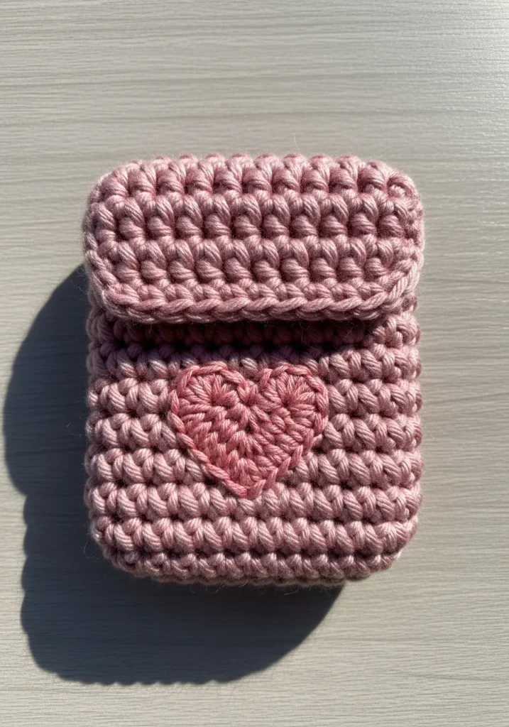 This charming little accessory is crafted from a sturdy, dusty rose cotton yarn that gives it a beautiful structure and a soft matte finish. The design features a thick, ribbed texture created with tight crochet stitches to ensure your electronics stay safe and cushioned inside. Its highlight is a sweet, slightly darker pink heart appliqué stitched right onto the front, adding a pop of color and a handmade touch. The fold-over flap keeps everything secure while maintaining a clean, rounded silhouette that fits perfectly in a palm or a pocket.