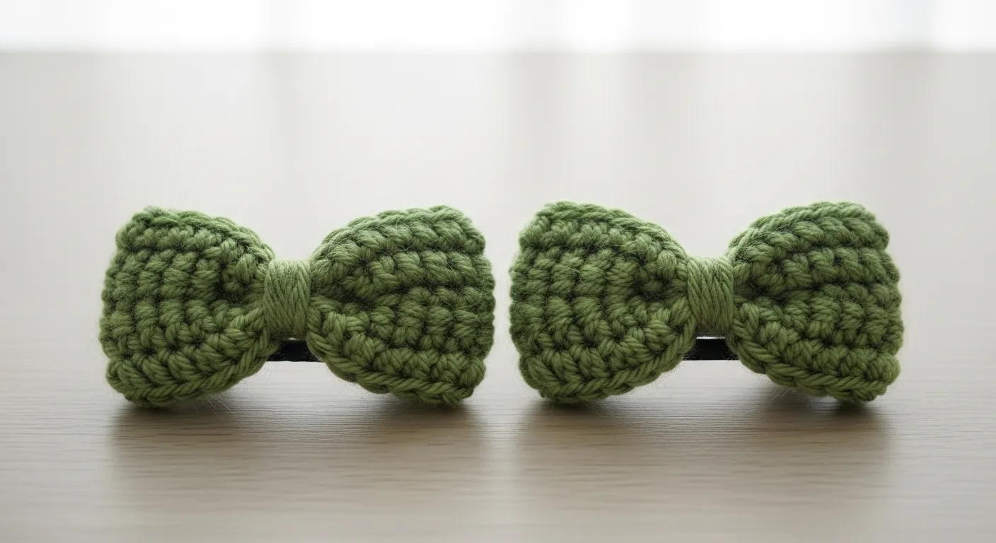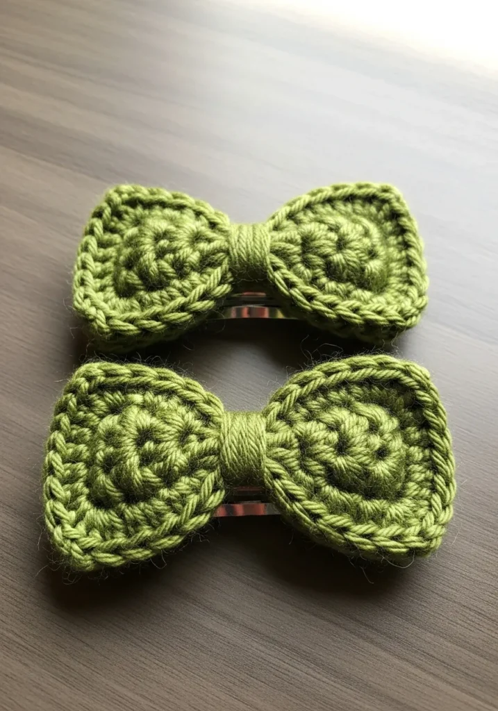 These charming hair accessories feature a textured, double-loop design worked in a rich moss green yarn. The stitch work creates a sturdy, ribbed pattern that gives the bows a wonderful three-dimensional shape rather than laying flat against the head. Each piece is finished with a thick yarn wrap around the center to mimic a traditional ribbon knot and is securely mounted onto a classic silver alligator clip. The earthy tone and organic wool-like texture make them a perfect choice for adding a cozy, cottagecore vibe to any hairstyle.
