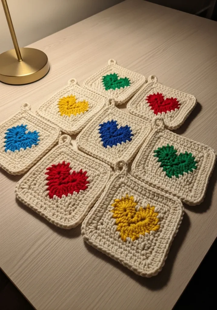 These charming kitchen accessories feature a textured heart motif center stage, framed by a sturdy square border of creamy off-white yarn. The hearts pop in a vibrant palette of primary red, sunny yellow, forest green, and royal blue, creating a cheerful rainbow effect when displayed together. Each potholder is crafted with a thick, heat-resistant cotton yarn that feels substantial and soft to the touch. The design includes a handy hanging loop at the top corner, making them just as practical for storage as they are for protecting your countertops from hot pans.