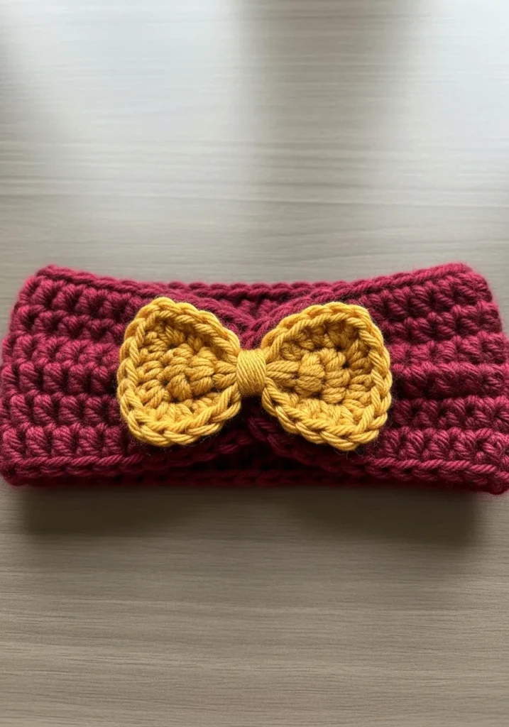 This charming headband features a deep burgundy base worked in a thick ribbed stitch that looks incredibly cozy and warm. The rich wine color provides a sophisticated backdrop for the bright mustard yellow bow sitting right in the center. The bow itself is crafted with two circular crochet rounds and finished with a neat yarn wrap in the middle to give it that perfect cinched shape. Using a chunky wool blend yarn gives this piece a wonderful squish factor, while the contrasting colors make it a bold accessory for any chilly day outfit.